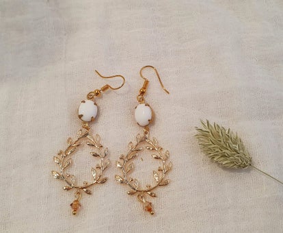 Ces boucles d'oreilles sont composées de connecteurs de jonction rétro ( 10x8mm) en pâte de verre blanc dans un support en laiton doré, de couronnes de laurier doré à l'or fin et de toupies en cristal de swarovski.