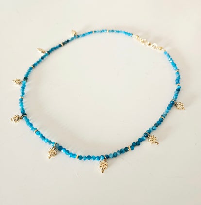 Ce ras de cou est monté sur du fil de soie.Ils est composé de délicates pierres semi précieuses ,des petites apatites bleues facettées et de perles et de perles plaqué or.