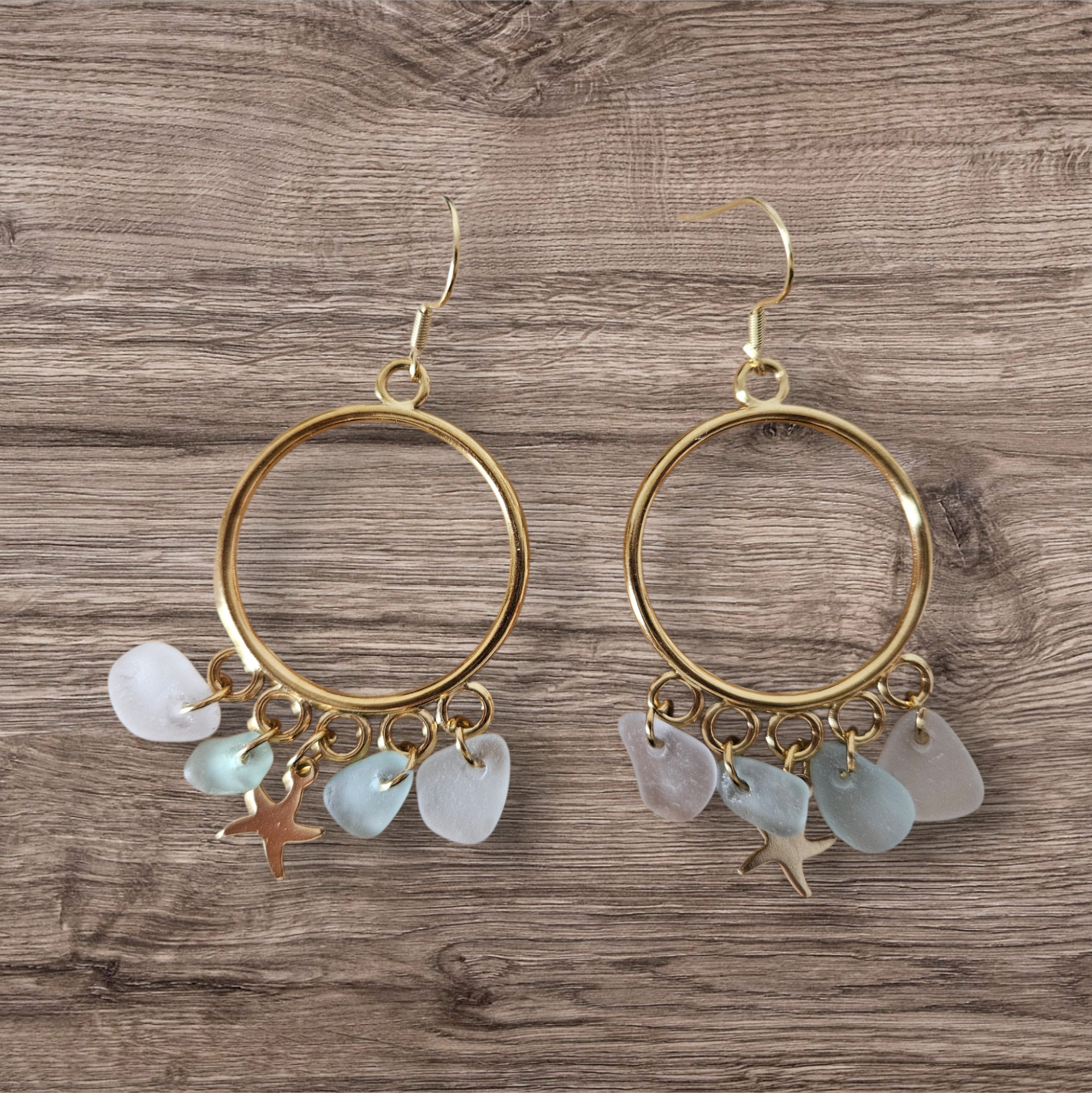 Ces créoles sont composées de chandeliers cercles en acier inoxydable plaqué ( 40x30 mm), de breloques étoiles de mer en acier inoxydable et de morceaux de verre blancs et vert pale.