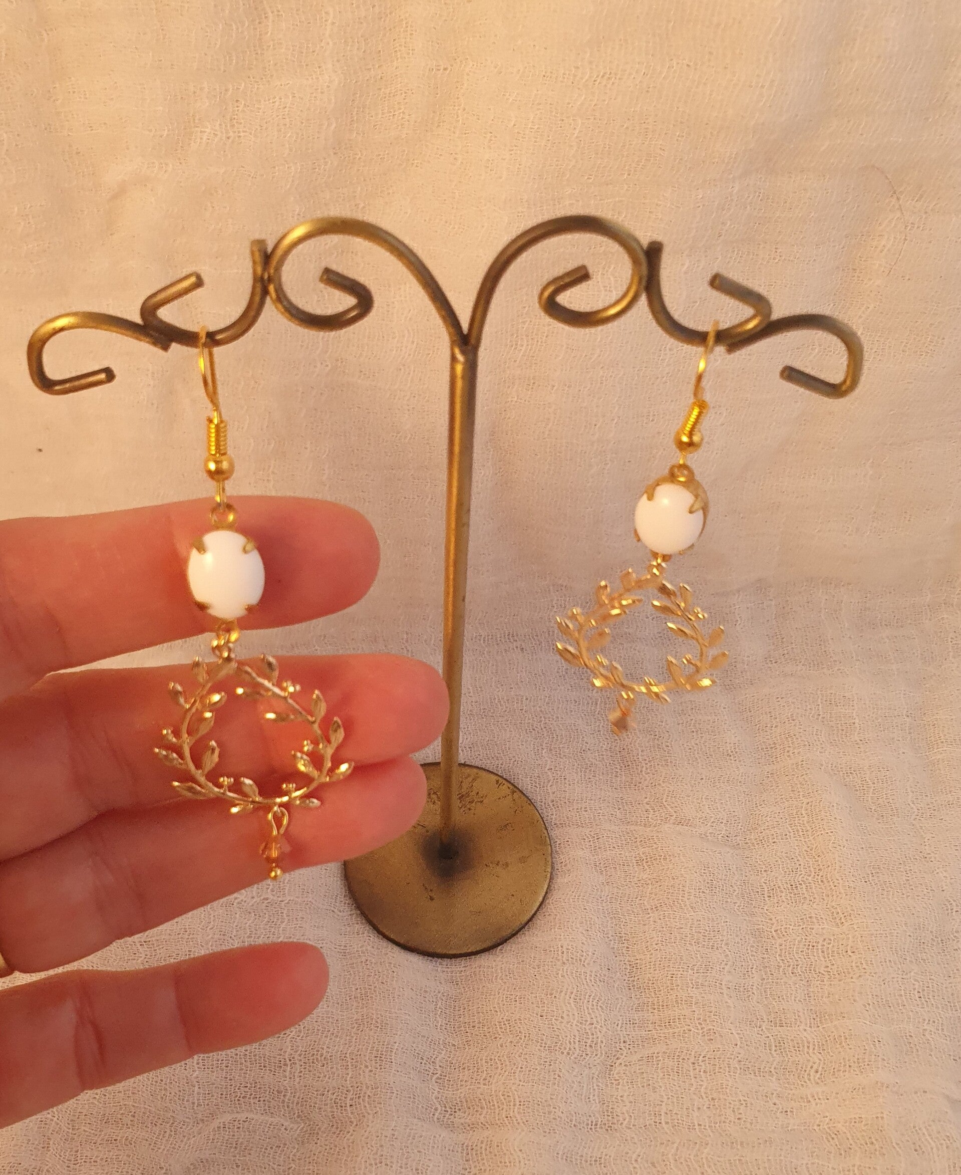 Ces boucles d'oreilles sont composées de connecteurs de jonction rétro ( 10x8mm) en pâte de verre blanc dans un support en laiton doré, de couronnes de laurier doré à l'or fin et de toupies en cristal de swarovski.