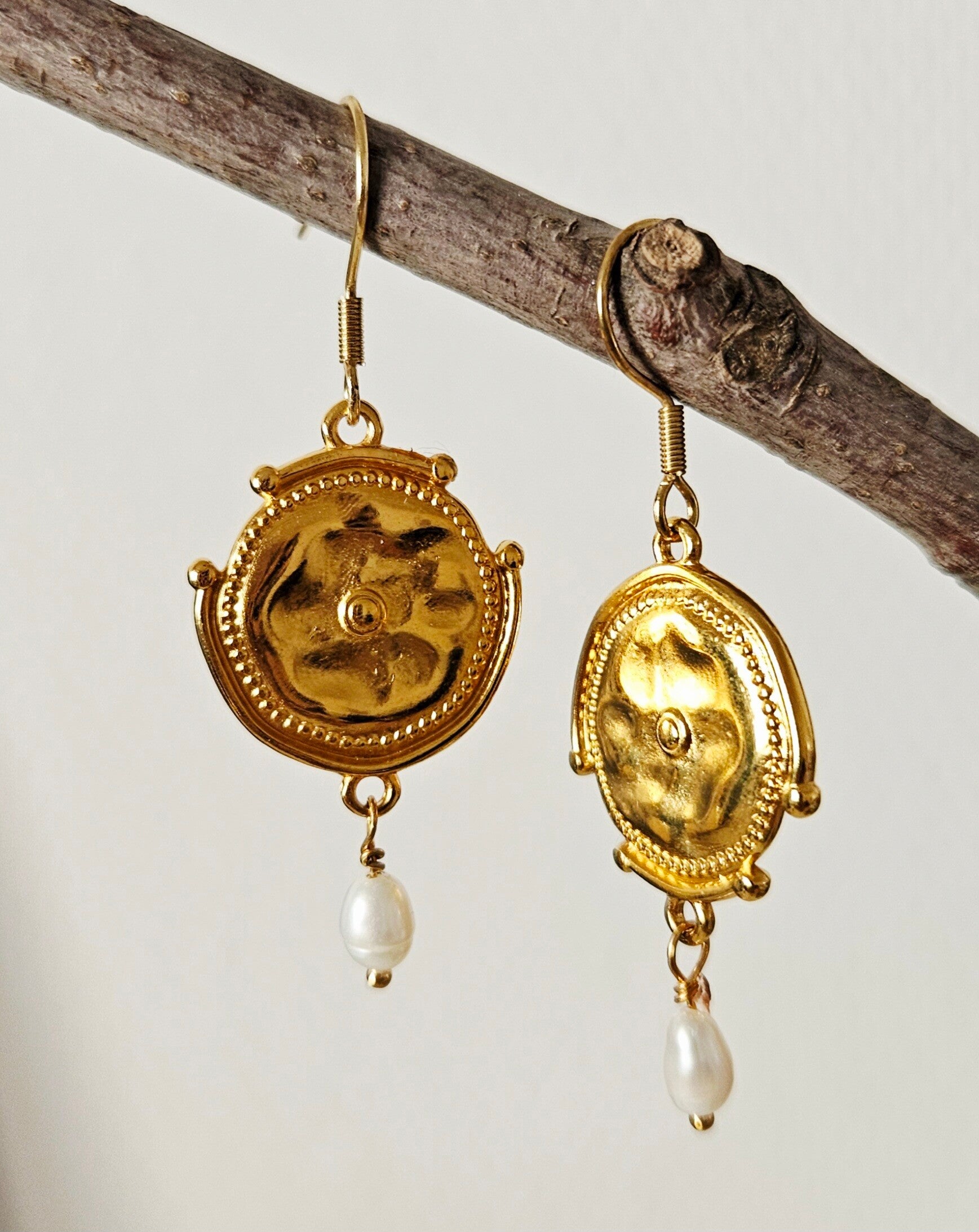 Ces boucles d'oreilles sont composées de connecteurs ronds en zarmac plaqué or 24 K et de petites perles d'eau douce.